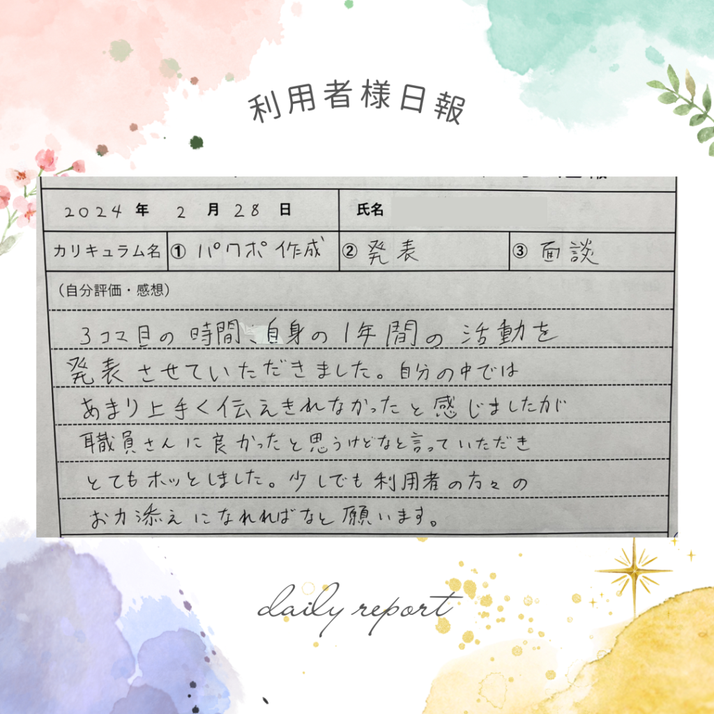 先月で卒業された利用者様から頂きました。卒業に至るまで二人三脚で見学や実習に行っていました。最初は人見知りがあってお話も苦手だった方が、こうしてみんなの前に立って発表をすることが出来るなんて…。職員としてもすごくうれしく思います。